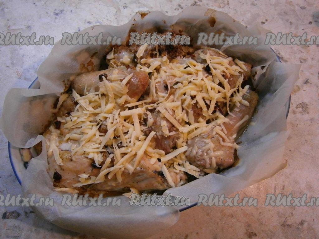 Поместить курицу в разогретую до 200 градусов духовку и запекать около 40 минут, после чего посыпать тертым сыром.