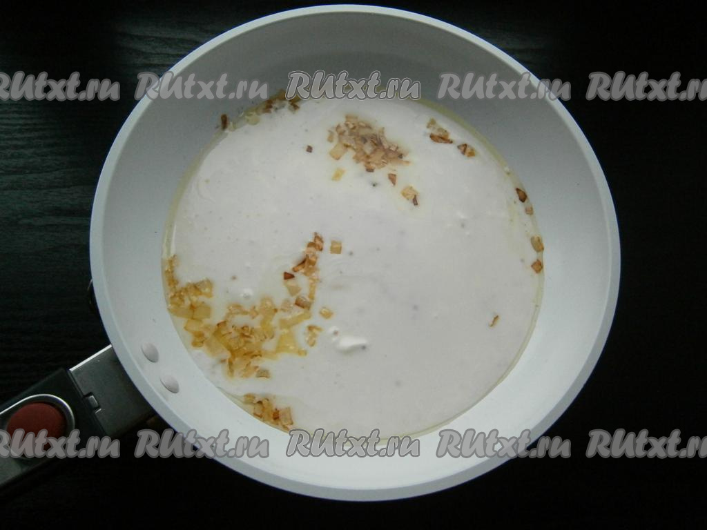 Лук обжарить на сковороде, помешивая, до золотистого цвета, затем снять с огня. Минуты через 3-4 влить в сковороду к обжаренному луку сметанный соус.