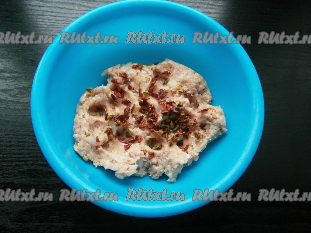 В готовый котлетный фарш добавить кусочки сушеной паприки или молотую паприку. Котлетный фарш я готовила так: мякоть свинины и мясо курицы (свинину и куриное мясо я взяла в соотношении 1:1) пропустила через мясорубку вместе с луковицей, добавила соль, специи и черный молотый перец по вкусу, а также, предварительно замоченные и отжатые, пару ломтиков белого хлеба. Фарш хорошо перемешала и отбила о дно миски.
