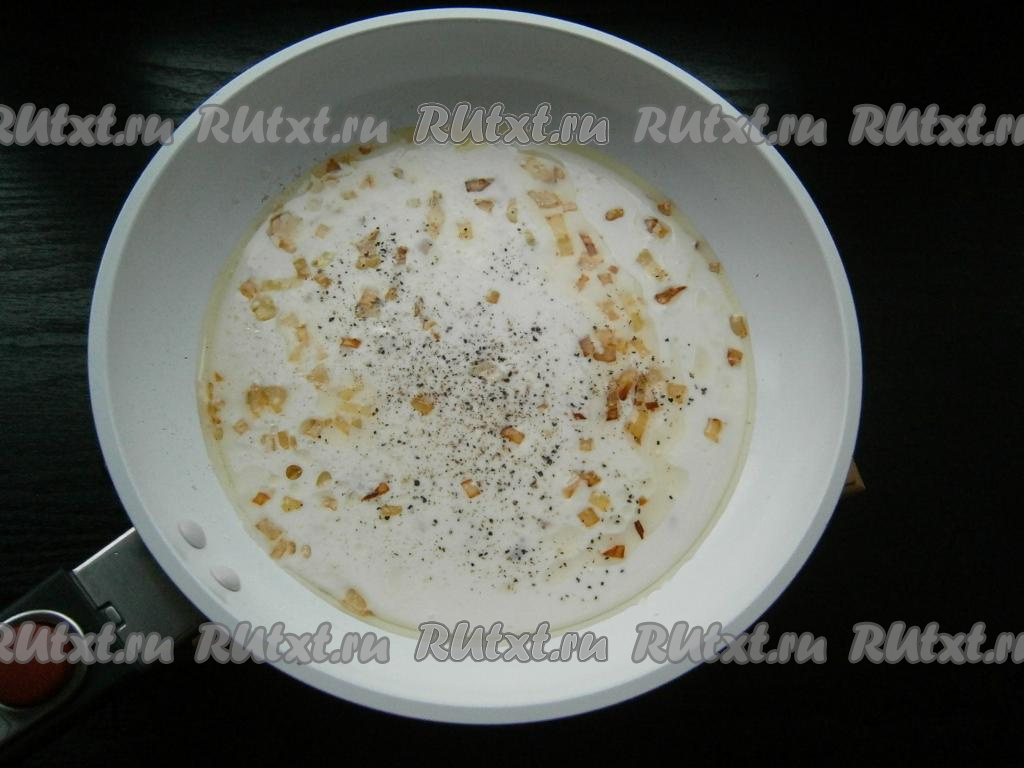 Посолить соус и поперчить по вкусу, поместить сковороду на огонь.