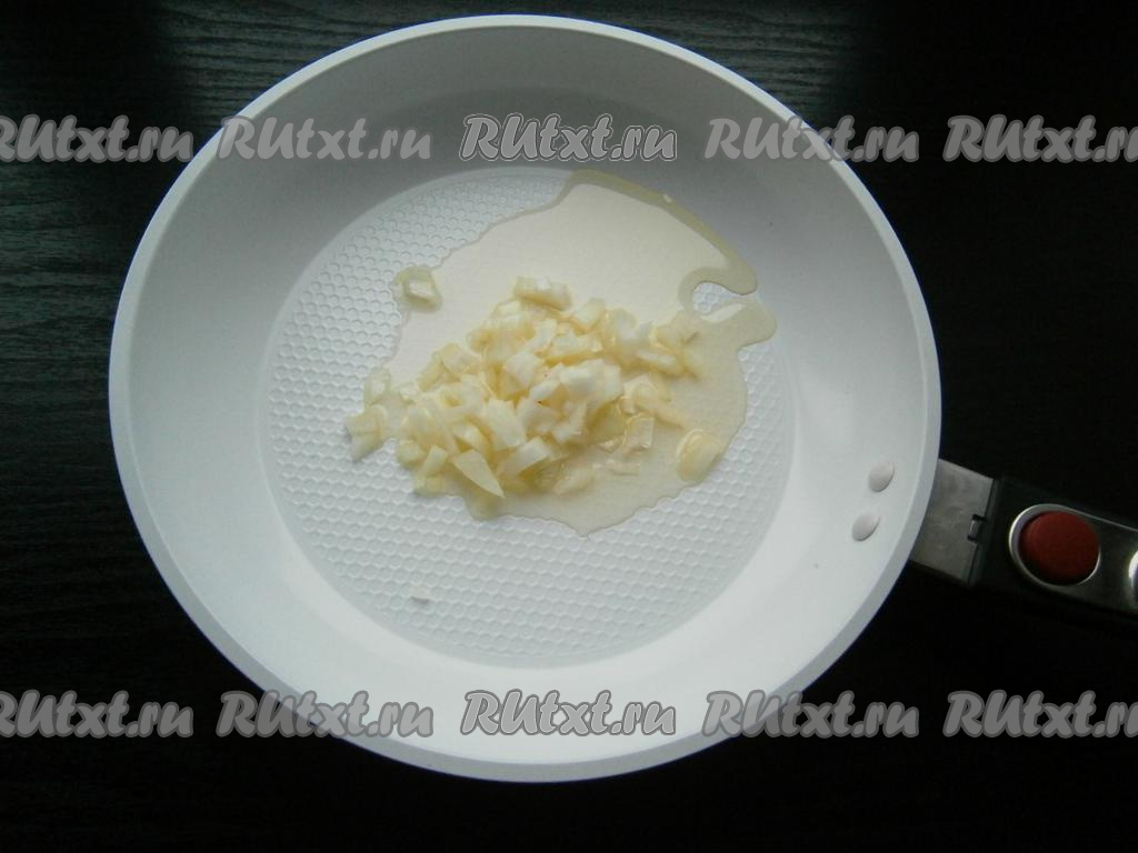 Очищенный репчатый лук мелко нарезать, поместить в сковороду с растительным маслом.
