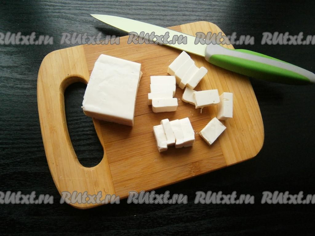 Далее тщательно фарш перемешать. Сыр плавленый нарезать небольшими кусочками.