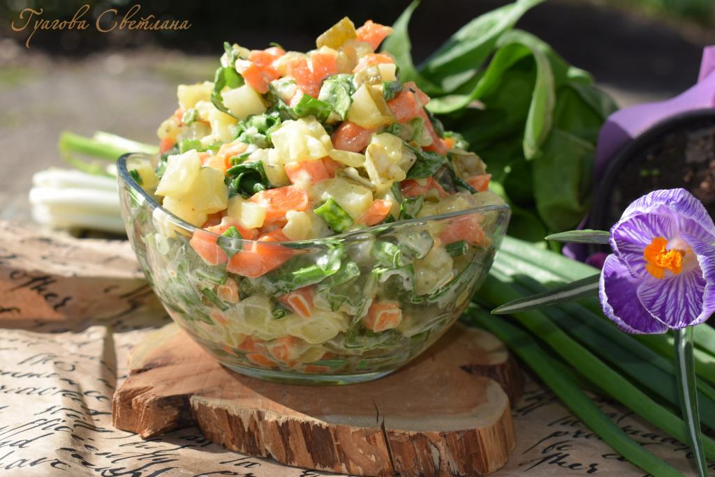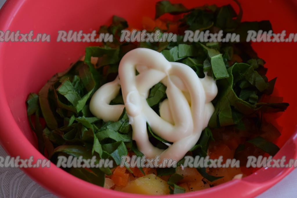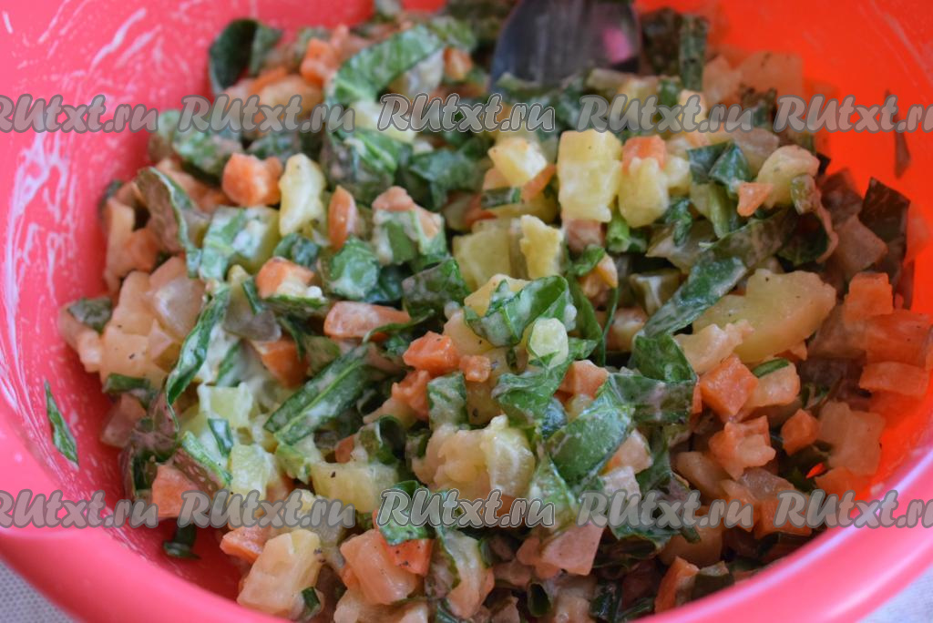 Шпинат, соль, перец и постный майонез добавляем в салат из картофеля, соленого огурца, моркови и лука.