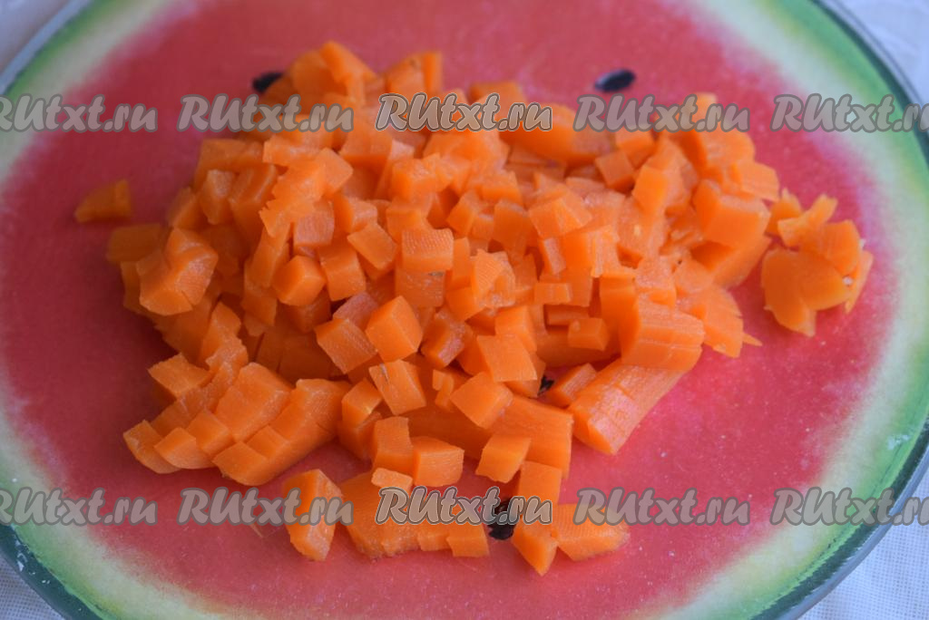 Сначала следует отварить картофель и морковь в мундире до готовности (готовые овощи будут легко прокалываться вилкой или ножом). Охладить и очистить овощи. Нарезаем морковь мелкими кубиками.