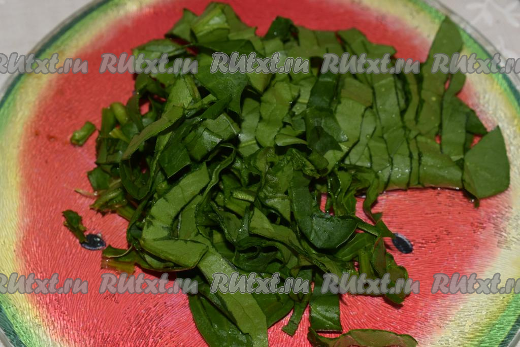Шпинат моем, обсушиваем и нарезаем на тоненькие полоски (если нет шпината, то можете приготовить салат и без него, тоже очень вкусно).