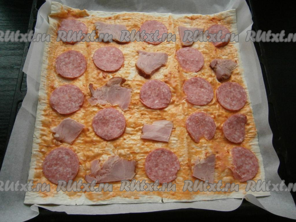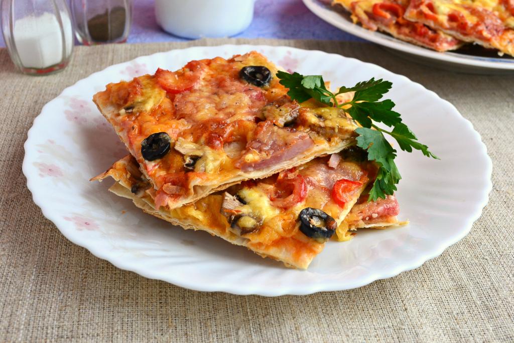 Невероятно вкусную, тонкую, хрустящую и в тоже время сочную пиццу, приготовленную на лаваше в духовке, сразу же, пока она горячая, нарезать на кусочки и подать к столу.