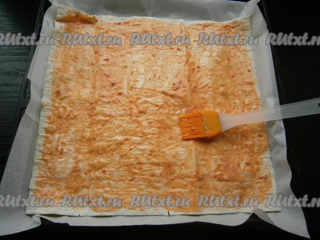 Противень застелить пергаментом, выложить на него лист лаваша. Грамм 15 сыра натереть на крупной терке и посыпать лаваш.
