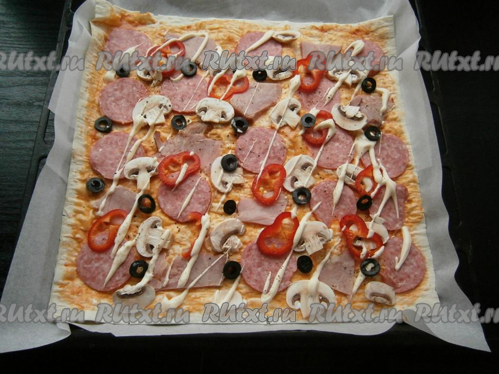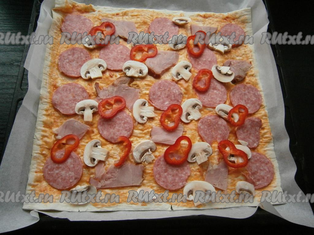 Выпекать пиццу в разогретой до 230 градусов духовке около 10-15 минут.