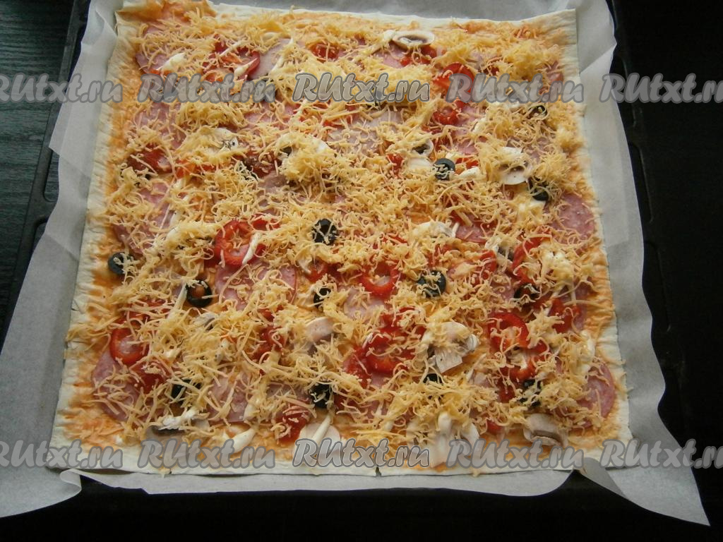 Оставшийся сыр натереть на средней или мелкой терке и щедро посыпать пиццу сверху.