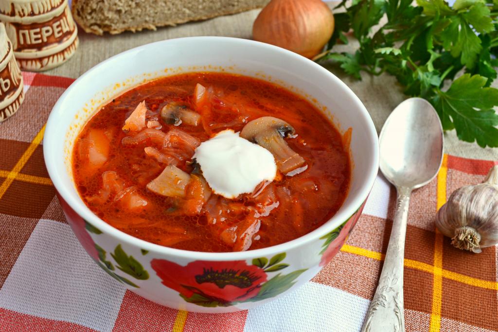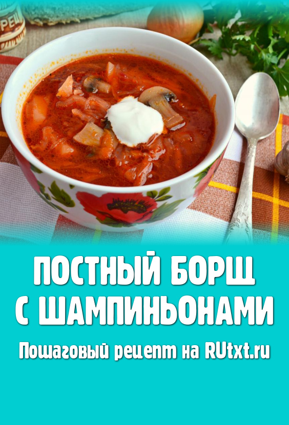 Если вы соблюдаете Пост или вам по каким-либо причинам нельзя употреблять мясо и мясные бульоны, предлагаю приготовить постный борщ с шампиньонами. Блюдо получается очень вкусным, наваристым, достаточно сытным, в нем абсолютно не ощущается отсутствие мяса. Подать такой борщ можно на обед, по желанию, со сметаной.