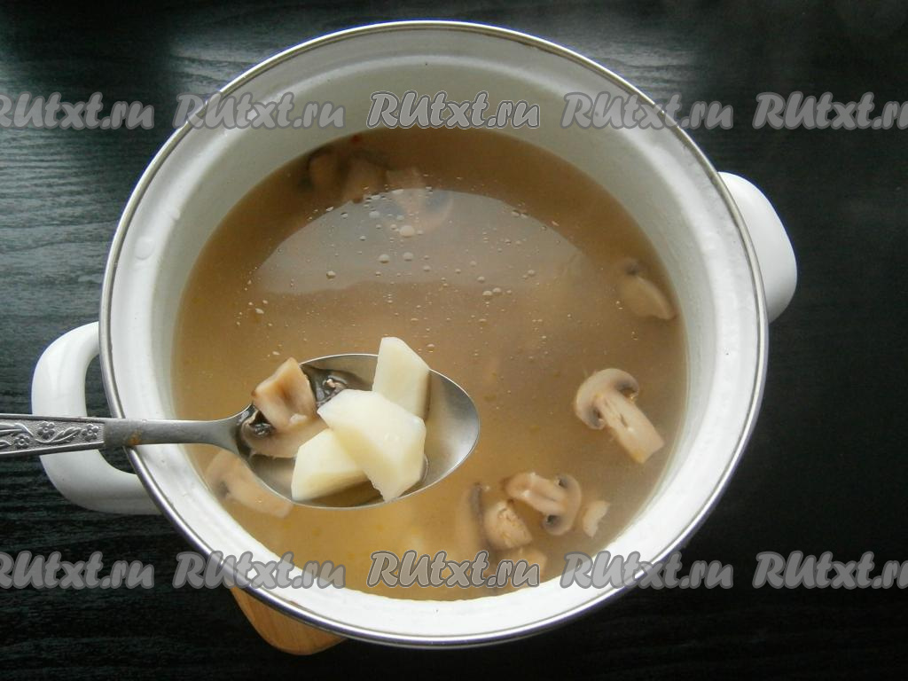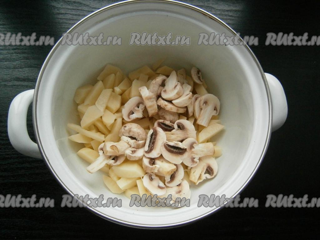 Картофель очистить и нарезать его небольшими кусочками в кастрюлю. Добавить нарезанные на 4-6 частей шампиньоны.