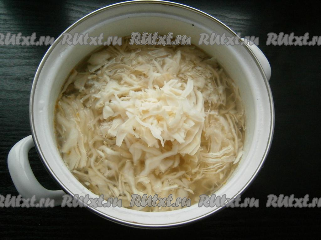 В кастрюлю с готовым картофелем и грибами добавить тонко нашинкованную капусту.
