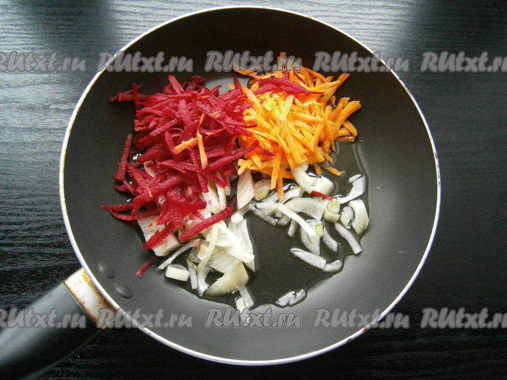 Очищенный лук нарезать кусочками. Свеклу и морковь очистить, натереть на крупной терке. Поместить морковь, свеклу и лук в сковороду с подсолнечным маслом.