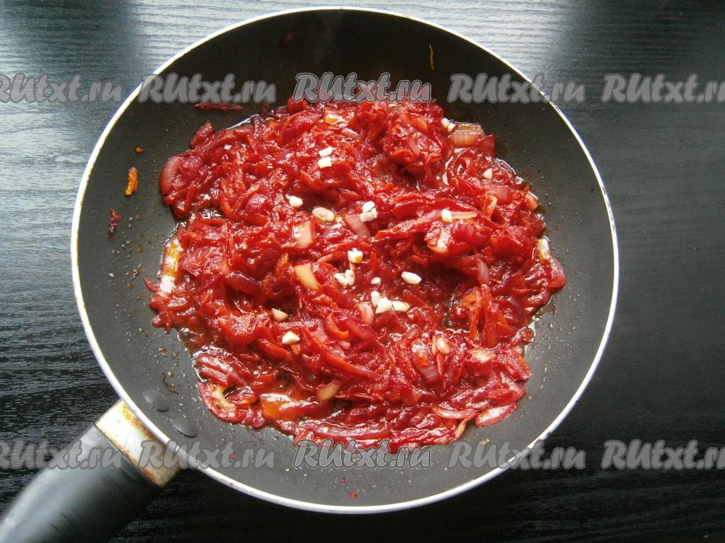 Обжарить овощи на среднем огне, помешивая, до мягкости, затем добавить томатную пасту и влить 100-150 мл горячего бульона из кастрюли. Перемешать содержимое сковороды, добавить немного соли и сахара, протушить на слабом огне минут 5, в конце тушения добавить измельченный чеснок, перемешать.
