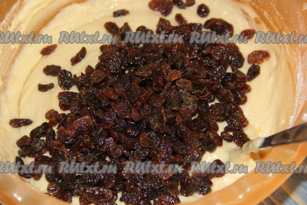 В роли начинки можно использовать изюм, орехи или цукаты. Я использовала изюм, предварительно обдав его кипятком и обсушив. Добавить изюм в тесто и аккуратно перемешать.
