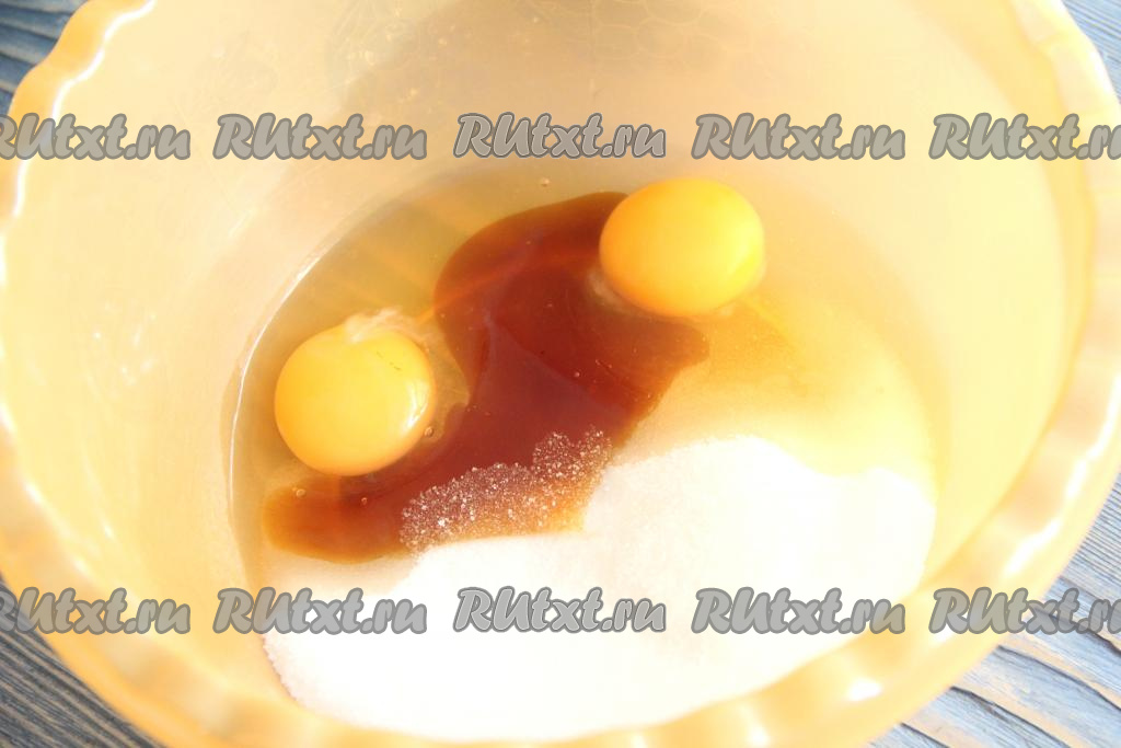 Соединить в глубокой миске сахар, ванильный сахар, яйца и мёд. Если мёд крупинками, лучше его прогреть до жидкого состояния.