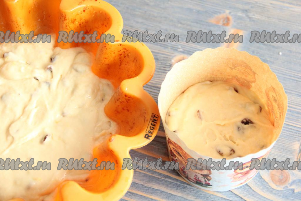 Разложить тесто по формам. Я выпекала в силиконовой и бумажной форме. Заполнить формы на 1/2 объёма.