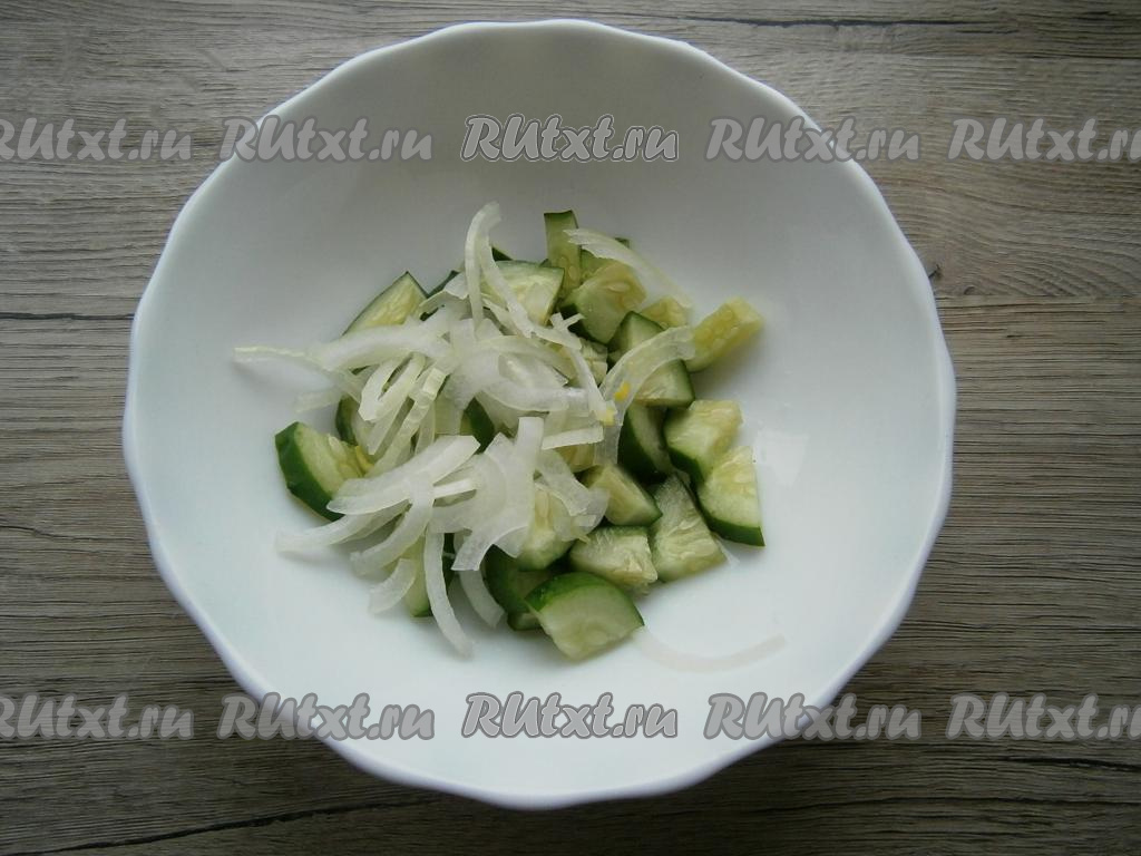 Свежий огурец нарезать полукружками или четвертинами (не тонкими). Добавить нарезанный тонкими полуколечками или четвертинами очищенный репчатый лук.