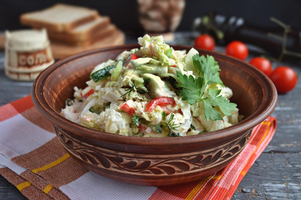 Свежий, хрустящий и очень вкусный салат, приготовленный из пекинской капусты с крабовыми палочками и помидорами, выложить в салатник, украсить веточкой петрушки и подать к столу сразу же.