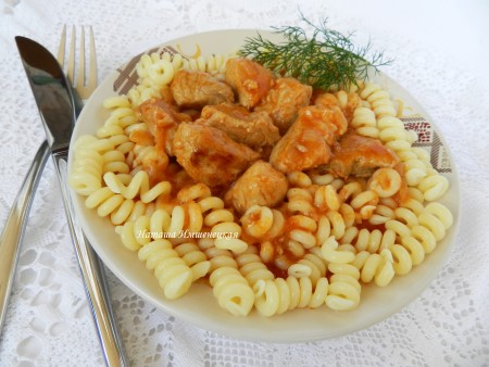 Хочу познакомить вас с рецептом приготовления вкусного гуляша из свинины с подливкой из томатной пасты. Это мясное блюдо родом из венгерской кухни. Свинина получается мягкой, сочной, аппетитной. К столу это блюдо можно подать с макаронами, картофелем, рисом, либо с любым другим гарниром на ваш выбор, обязательно поливая томатной подливкой, в которой тушилось мясо.