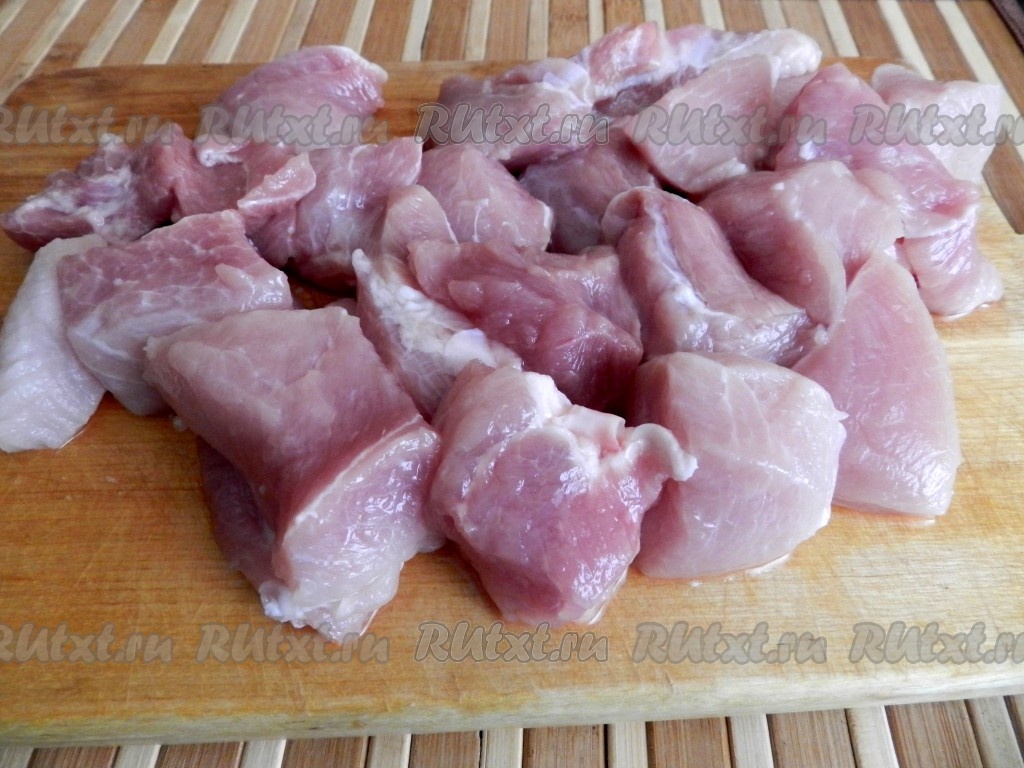 Мякоть свинины вымыть, обсушить, нарезать на кусочки размером примерно 3х3 сантиметра.