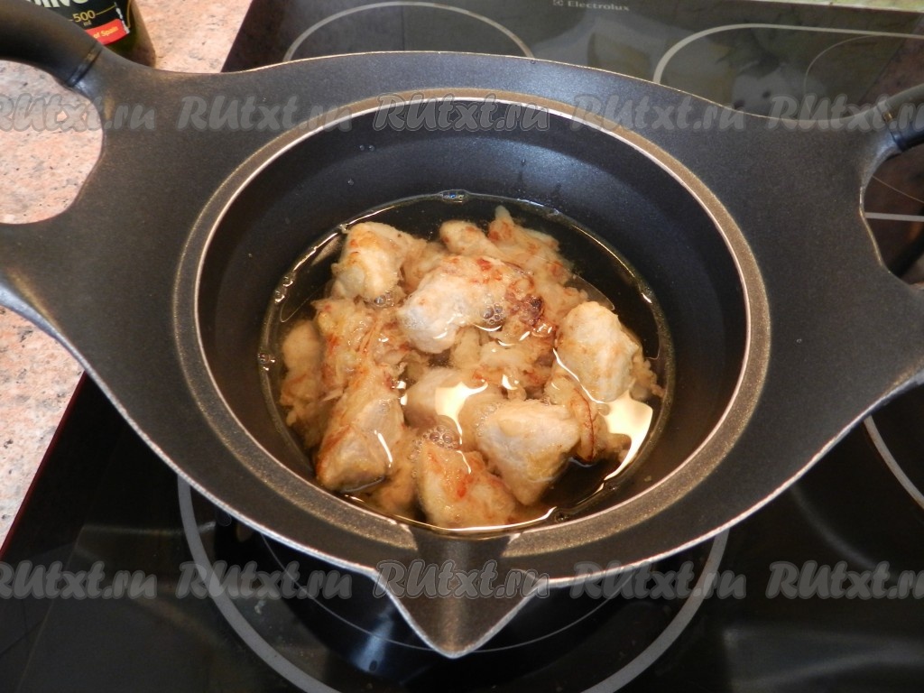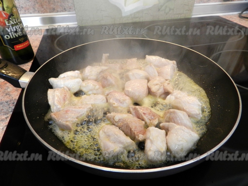 В сковороде разогреть растительное масло, выложить кусочки свинины, обжарить на огне выше среднего в течение 3-4 минут, достаточно часто переворачивая кусочки мяса.