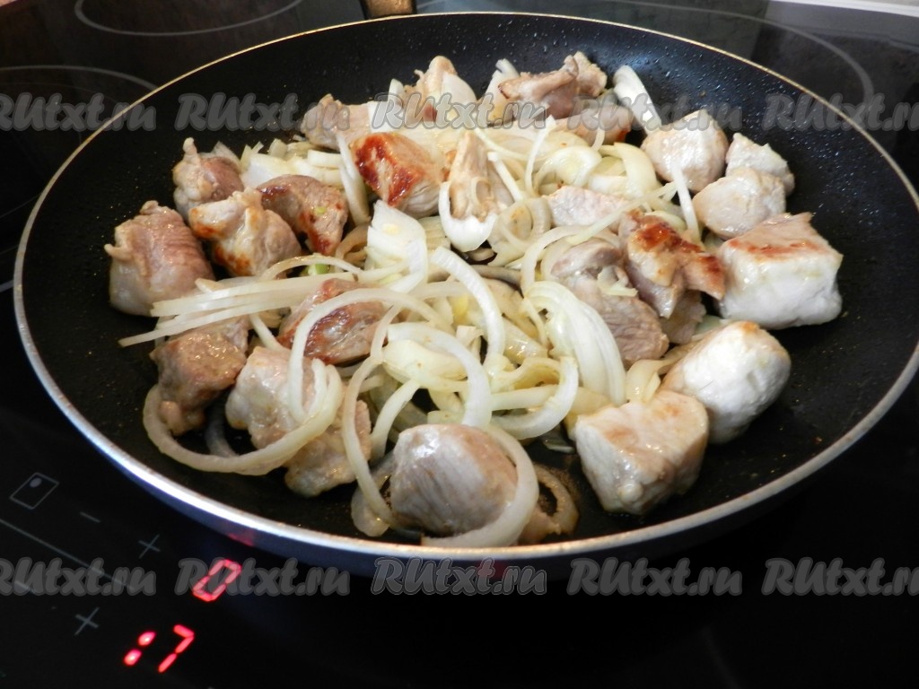 К обжаренной свинине добавить лук, перемешать, обжаривать 3-4 минуты на среднем огне, периодически перемешивая.