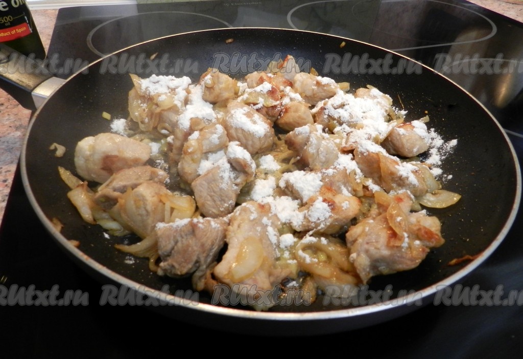 Присыпать мясо с луком мукой, тщательно перемешать, чтобы мука равномерно распределилась по свинине и впиталась в неё.