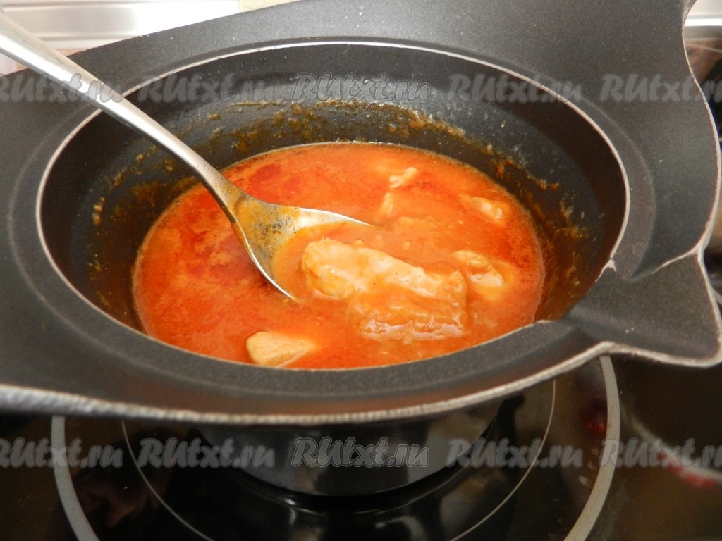 После того как свинина станет мягкой, добавить к ней пропущенный через пресс чеснок, специи, томатную пасту, перемешать, посолить по вкусу, довести подливку из томатной пасты до кипения, уменьшить огонь до минимума. Готовить гуляш из свинины под крышкой 15-20 минут.