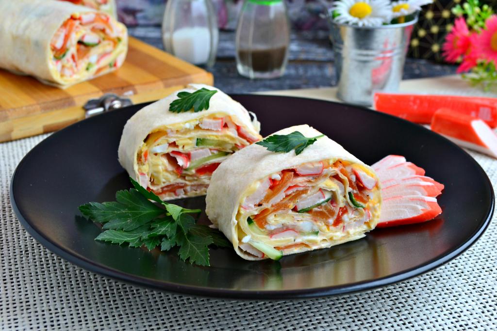 Очень вкусный рулет, приготовленный из лаваша с крабовыми палочками и огурцом, нарезать на части шириной около 4 см, красиво выложить на тарелку и подать к столу.