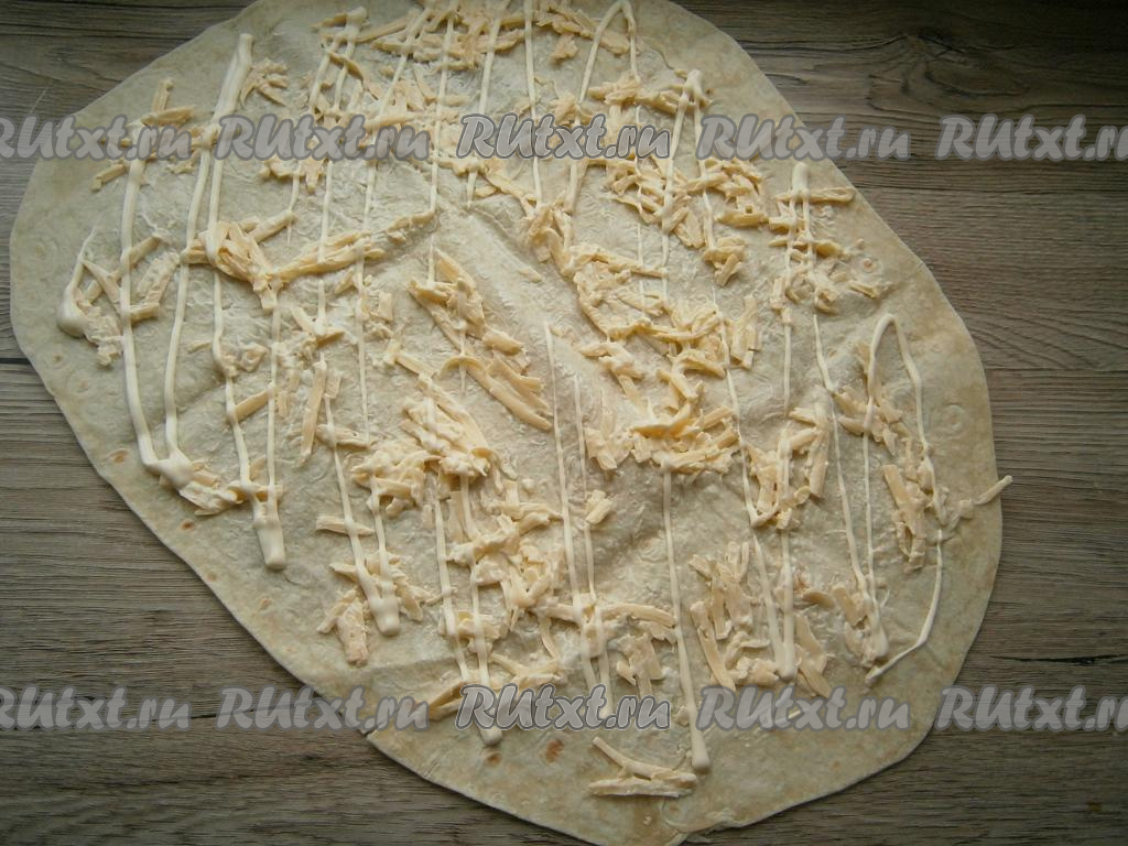 Твёрдый сыр натереть на крупной или средней терке, смешать с 30 граммами майонеза, нанести по всей поверхности лаваша. Часть оставшегося майонеза нанести сверху в виде полосочек.