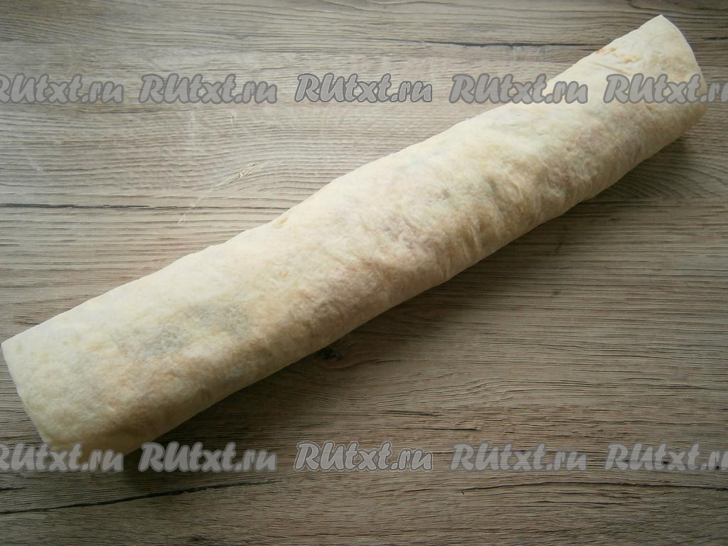 Лаваш плотно свернуть в рулет и, завернув в пищевую пленку, поместить в холодильник на 30-40 минут.
