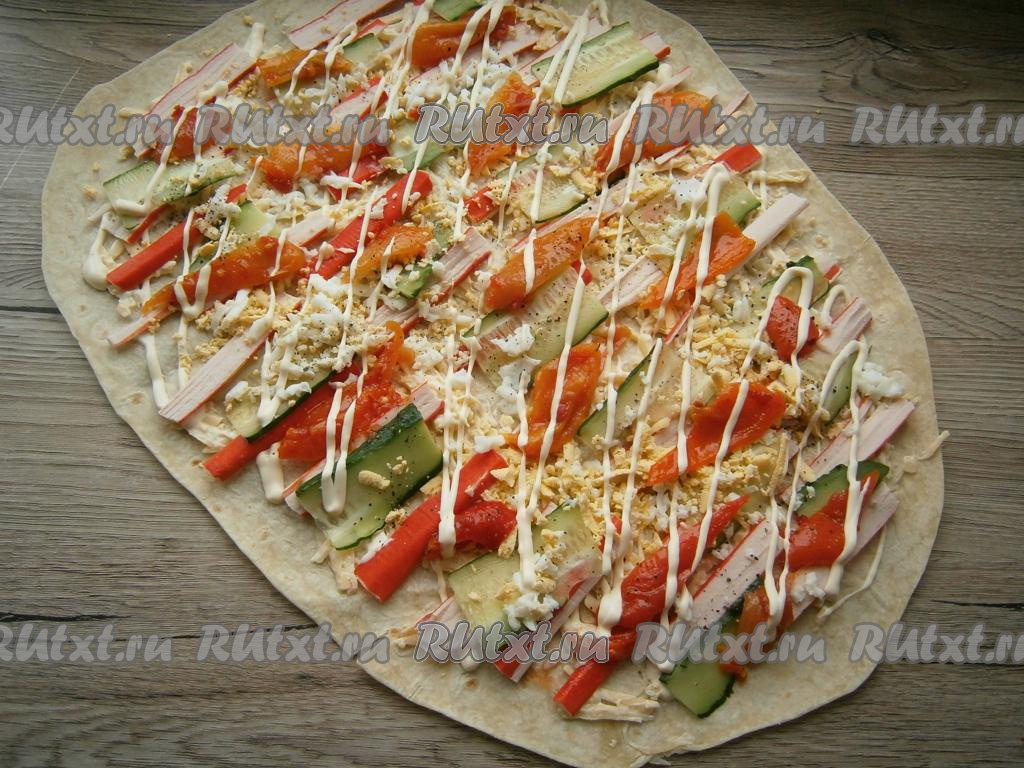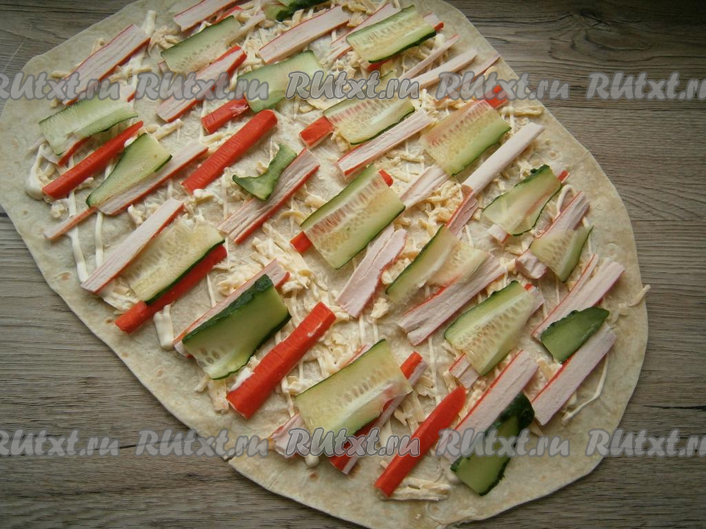 Крабовые палочки нарезать вдоль на 4-5 частей, огурец - тонкими слайсами или брусочками. Разместить крабовые палочки и огурец по всему лавашу горизонтально (как на фото).