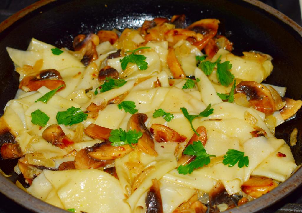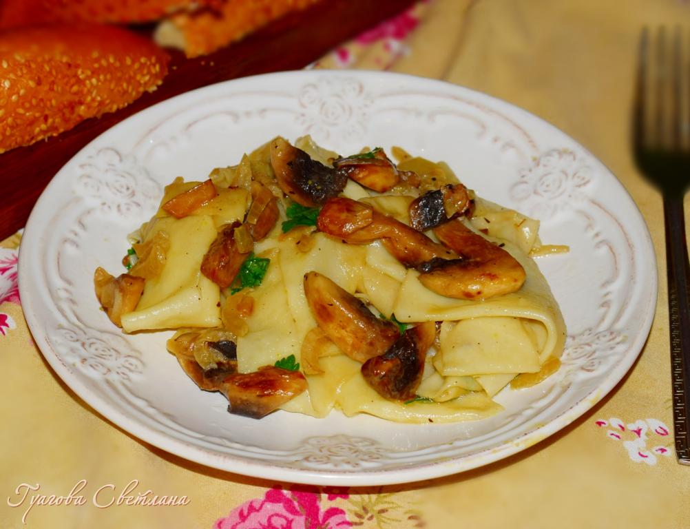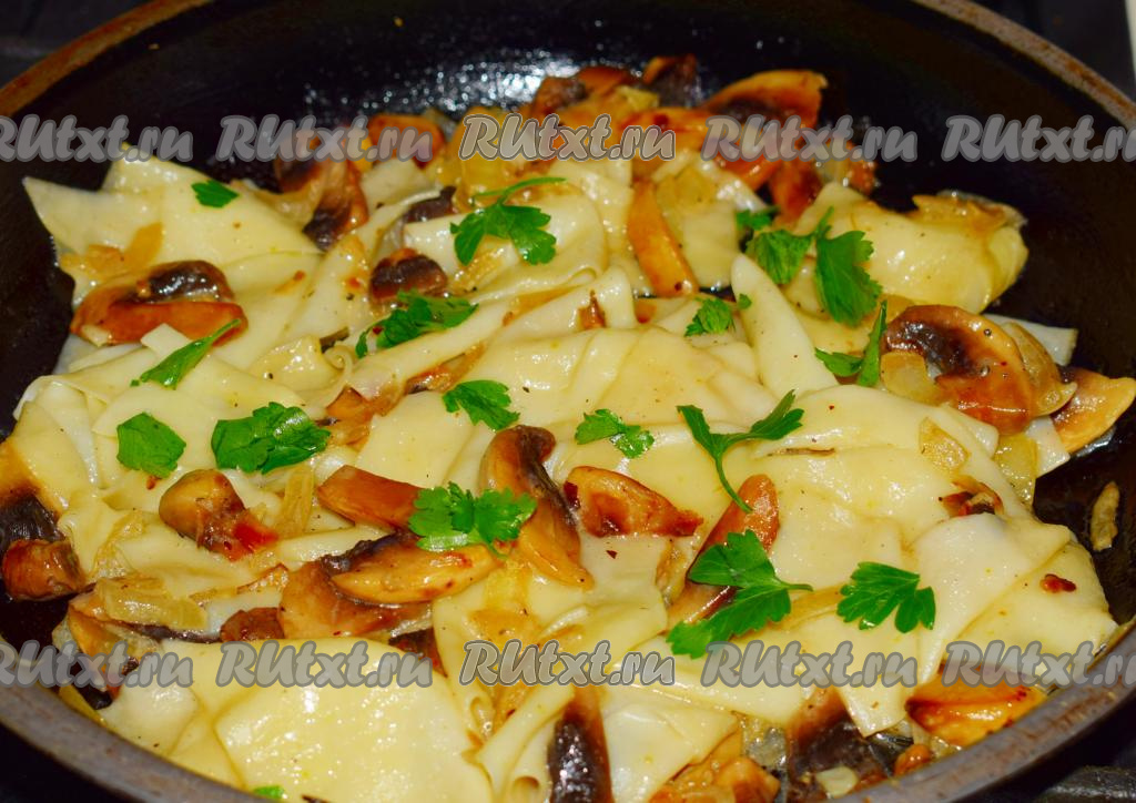 Очень вкусные шампиньоны, тушеные с луком, посыпать мелко нарезанной зеленью, дополнить гарниром и подать на стол. Я добавила к тушеным грибам готовую отваренную бешбармачную лапшу и слегка потушила все вместе в течение 2-3 минут.