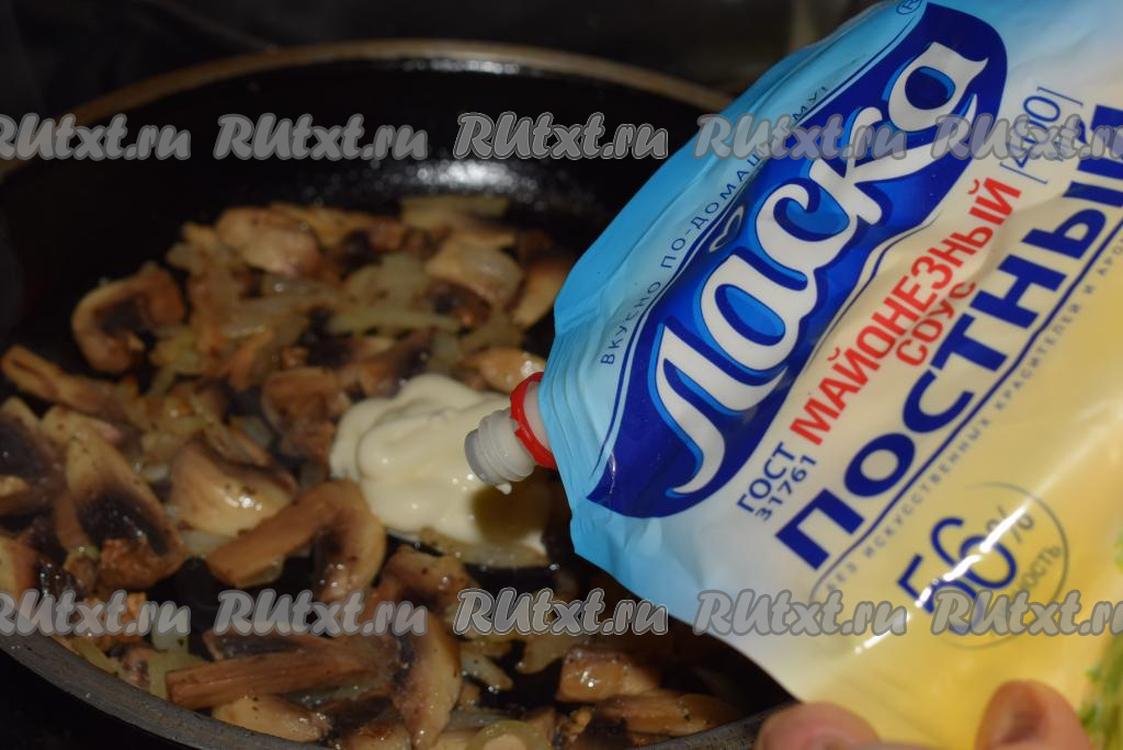 Посолить, поперчить грибы с луком и добавить сметану (или майонез).