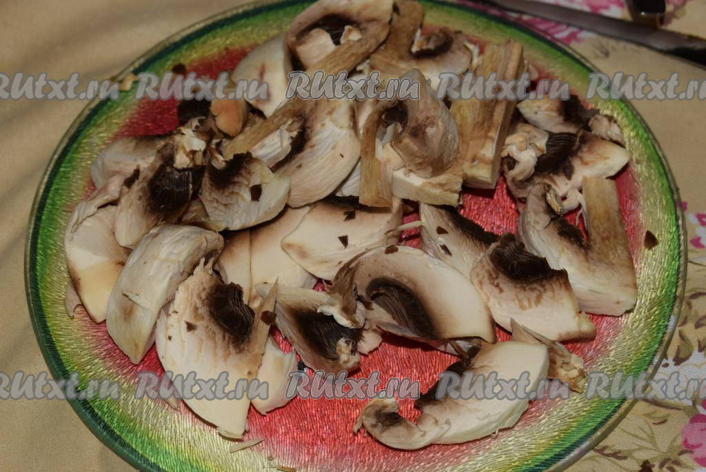 Шампиньоны очистить от пленочек, нарезать на средние или крупные кусочки, но не мельчить, так как при мелкой нарезке все соки грибов выжариваются и они при тушении не получаются такими сочными, как хотелось бы.