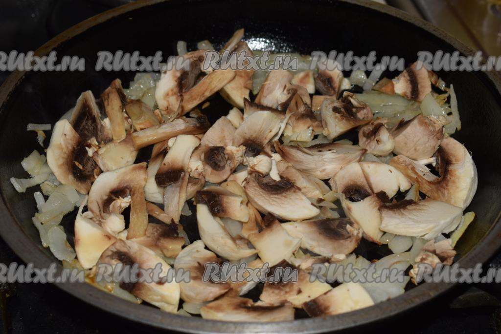 К луку добавить шампиньоны, перемешать и обжарить на медленном огне, примерно, 5-8 минут, не забывая периодически перемешивать.