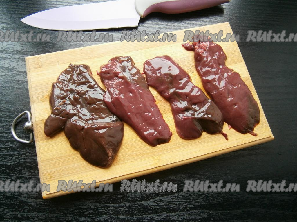 Печень разрезать на средние тонкие кусочки. Я индюшиную печенку разрезала вдоль на 2 части.