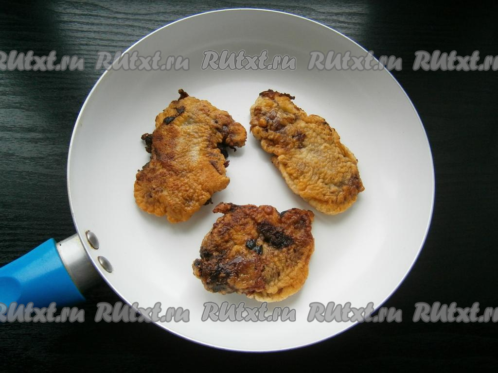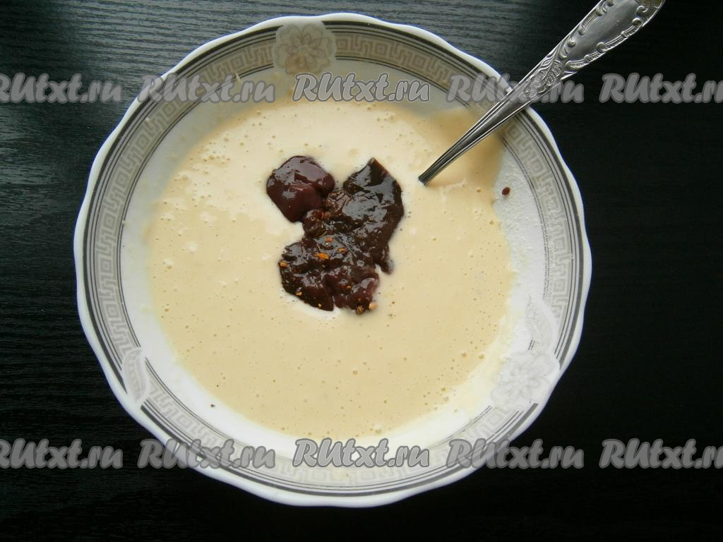Кляр должен быть похож по консистенции на жидкую сметану. Каждый кусочек печени опускать в кляр.