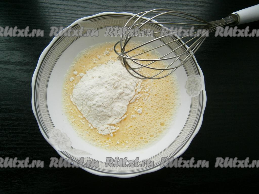 Хорошенько взбить кляр венчиком, добавить муку и перемешать.