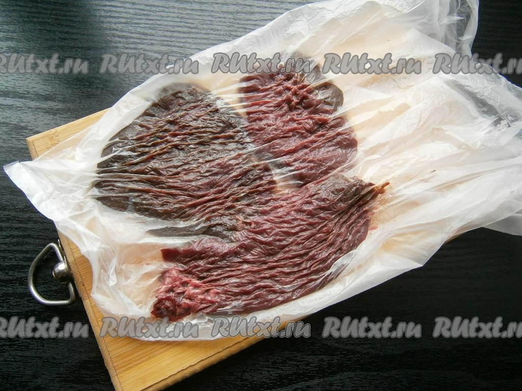 Накрыть печень целлофаном или поместить ее внутрь целлофанового пакета, отбить немного молоточком.