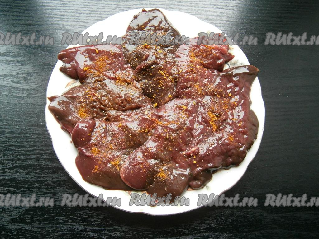 Отбитые кусочки печени посолить, посыпать специями и черным молотым перцем.