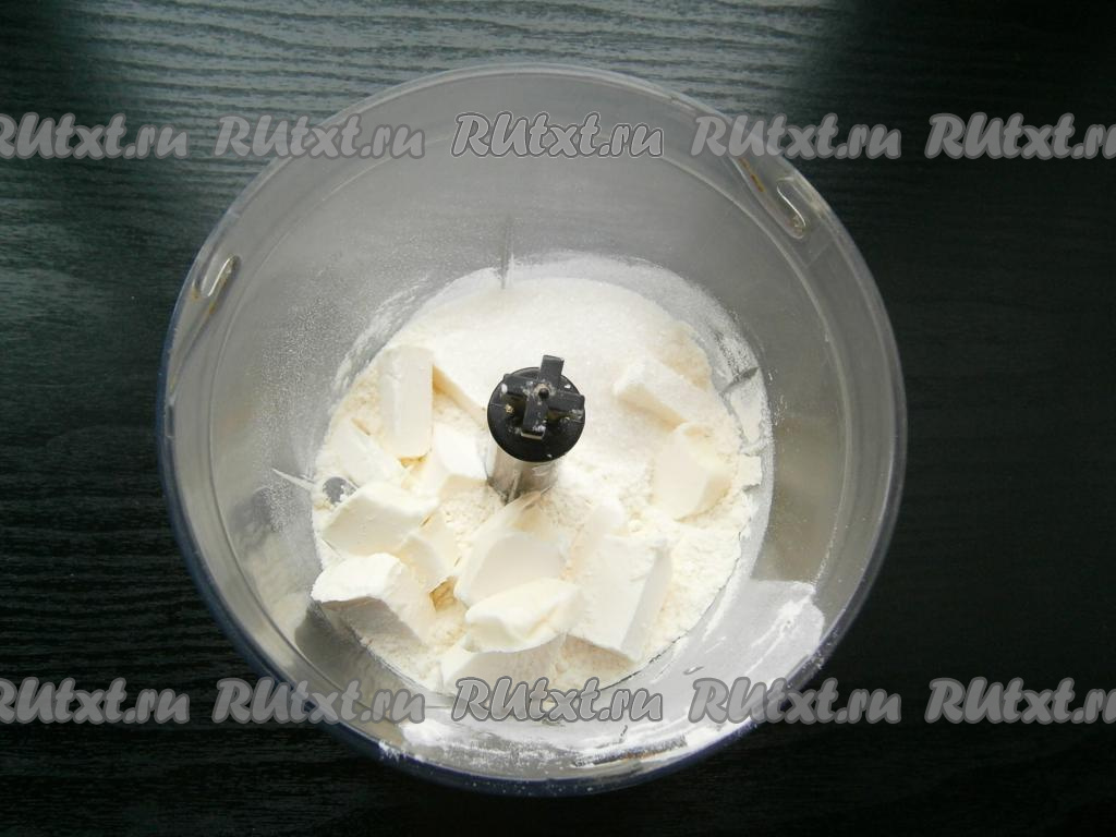 В чашу блендера всыпать муку, добавить сахар, соль и нарезанный кусочками холодный маргарин или масло.