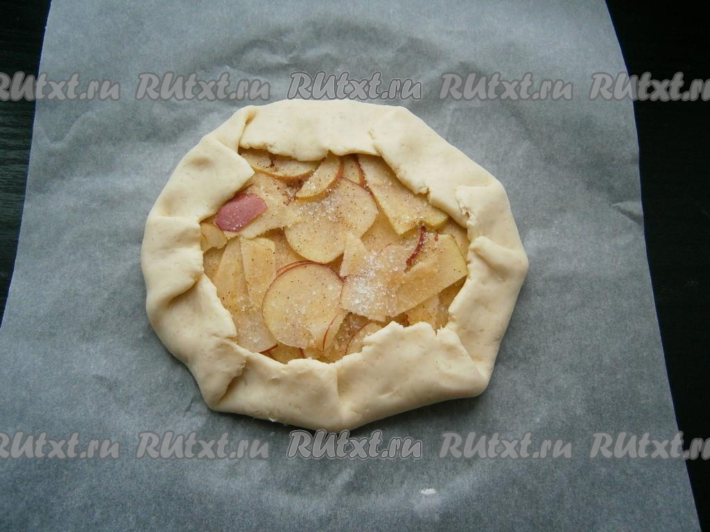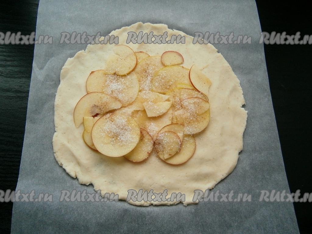 Тесто выложить на лист пергамента и руками растянуть, чтобы получилась тонкая круглая лепешка. Поместить ее вместе с пергаментом на противень. В центр лепешки выложить 2-3 слоя яблок, посыпая каждый слой сахаром и корицей.