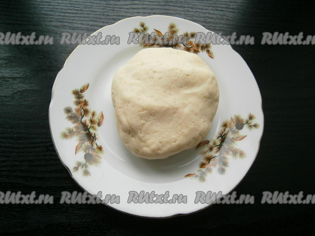 Тесто достать из чаши, оно должно быть мягким и нежным. Обмять тесто, сформировать колобок. Завернуть тесто в пищевую пленку и поместить в холодильник на 30 минут.