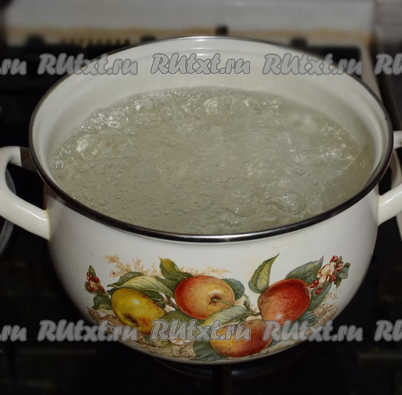 Для приготовления постного борща с консервированной фасолью в кастрюлю нальем 2,5 литра воды и доведем ее до кипения.