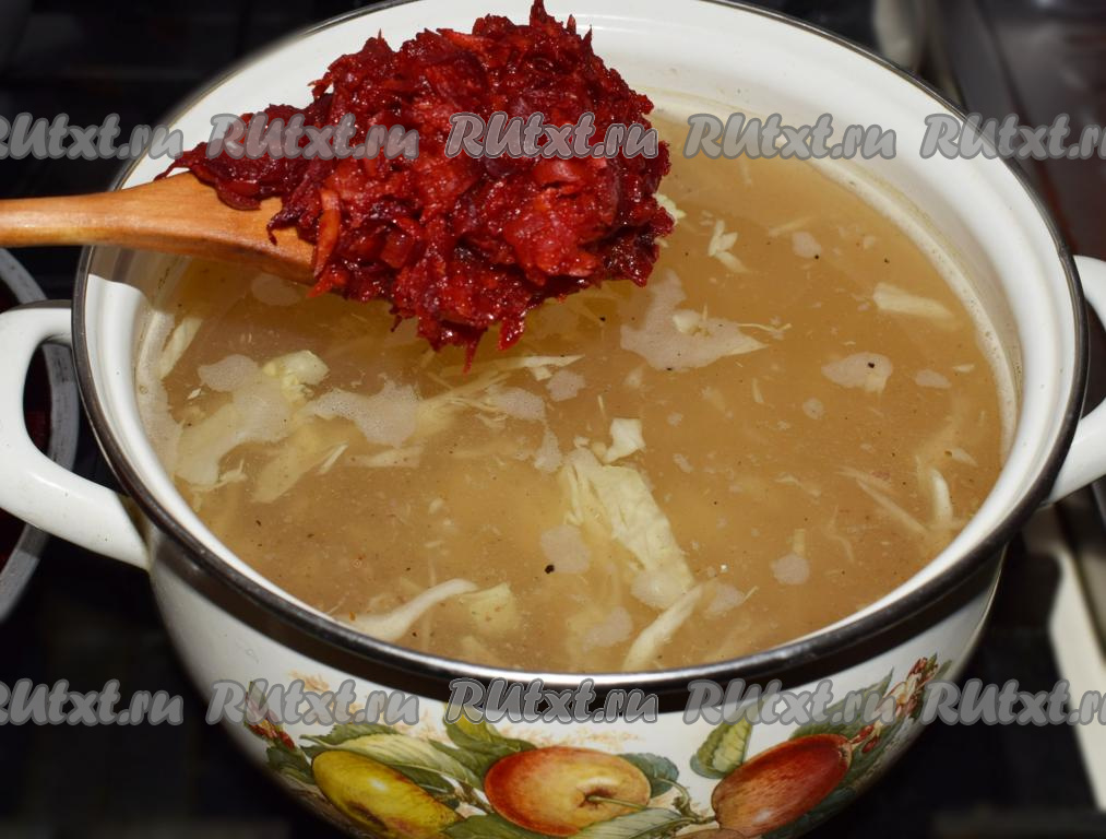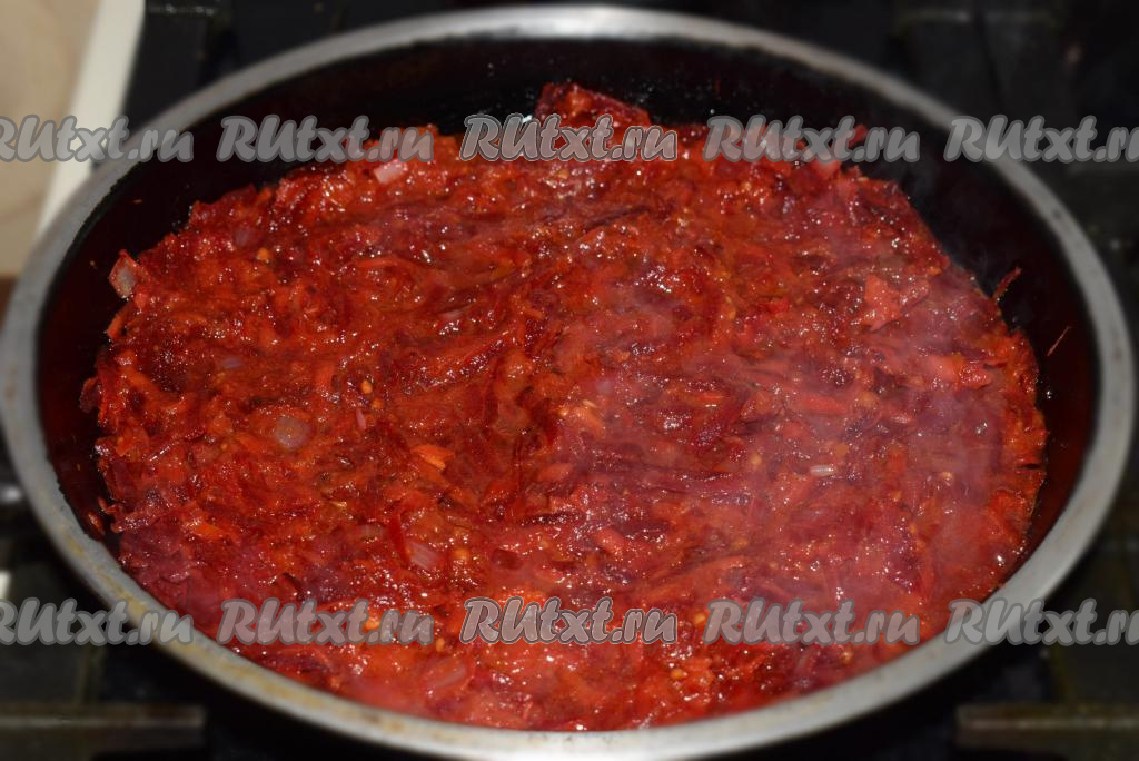 К практически готовому борщу добавляем тушеные овощи и доводим борщ до кипения.