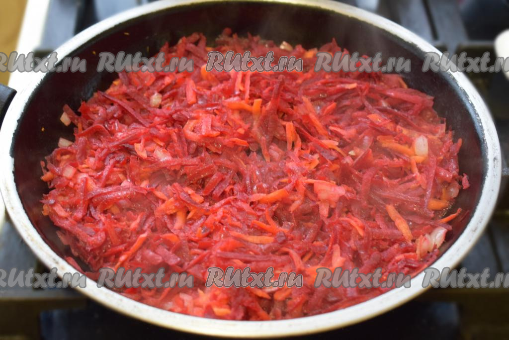 Нарежем лук мелко. Свеклу и морковь натрем на крупной терке. В сковороду нальем растительное масло и разогреем его. К маслу добавим лук, морковь и свеклу, поджарим овощи до прозрачности на небольшом огне, помешивая (обжаривать, примерно, 10-12 минут).