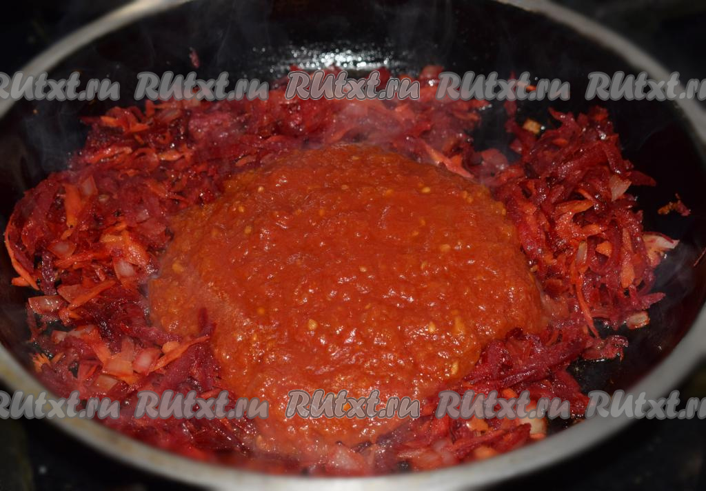 Томатную пасту разведём в 200 мл воды, добавим к обжаренным овощам и перемешаем.