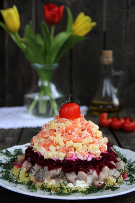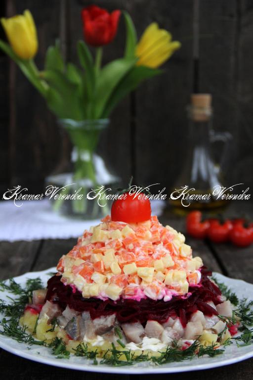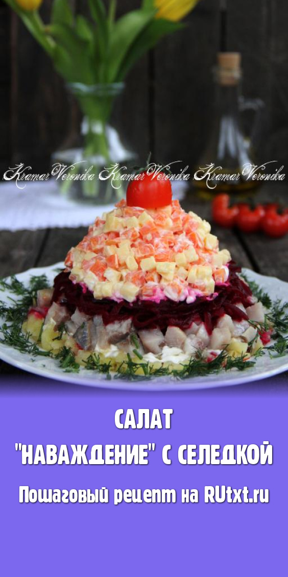Салат "Наваждение" очень похож на всеми любимый салат "Селедка под шубой", но есть и свои отличия. Так что если вы любитель салатов с сельдью, то обязательно приготовьте и оцените по достоинству это красивое и сытное блюдо.